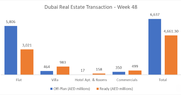 Total trading in Week 48 reached AED 11.30 billion this week across 5,457 transactions, a mild 1.6% dip in value from last week’s AED 11.48 billion, while transaction volumes were up 3.3%. Off-plan continued to lead the market, accounting for 58.7% of total value, with ready properties contributing the remaining 41.3%.