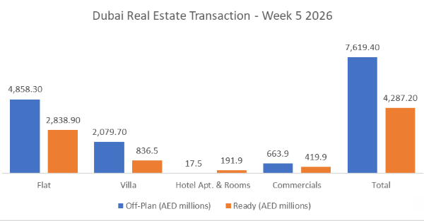 In Week 5, total trading reached AED11.91bn across 5,114 transactions. Off-Plan dominated with AED7.62bn (64.0%), while Ready accounted for AED4.29bn (36.0%).