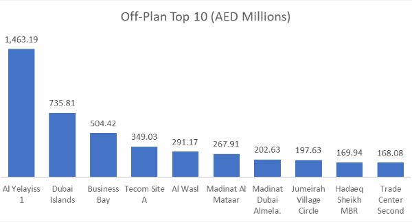 | The top 10 off-plan areas totaled AED4.35bn, representing 57.1% of all Off-Plan value (and 36.5% of the entire week). | ||||||||||||||||||
