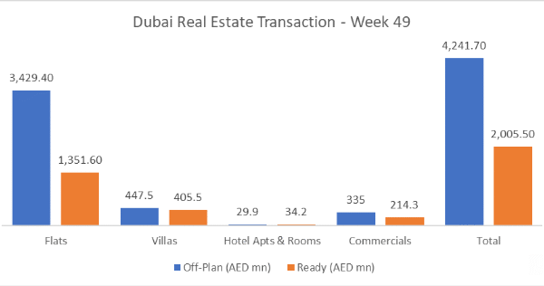 Total trading in Week 49 reached AED 6.25 billion a 44.7% drop in value from last week’s AED11.3 billion across 2,823 transactions. Off-Plan dominated with AED 4.24 billion (67.9%), while Ready stock contributed AED 2.01 billion (32.1%). Week 49 included only three working days, which explains much of the drop in volume versus the prior week.