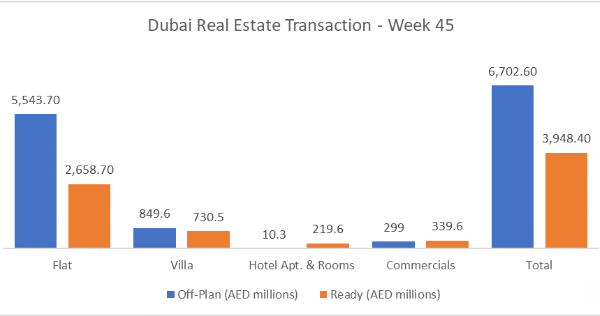 In Week 45, the total trading reached AED 10.65 billion across 5,220 transactions. A 7% increase against the previous week. Off-plan contributed AED 6.70 billion (62.9%), while Ready accounted for AED 3.95 billion (37.1%).