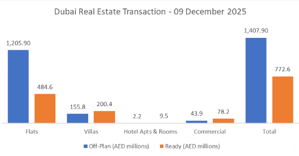 On the 09-Dec-2025, the total transacted value reached AED 2,180,495,339. Off-plan dominated with AED 1,407,850,683 (64.6%), while Ready accounted for AED 772,644,656 (35.4%).