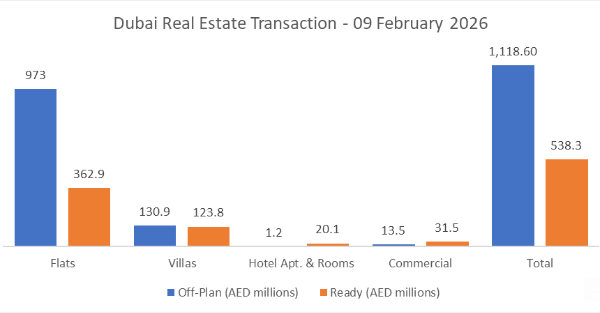 On the 09-Feb-2026, the total transacted value reached AED 1.66B. Off-plan dominated with AED 1.12B (67.5%), while Ready accounted for AED 538.3M (32.5%).