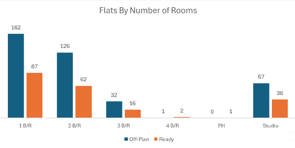 | Off-plan activity was overwhelmingly flat-led, with villas a distant second and minimal contribution from hotel and commercial transactions. |