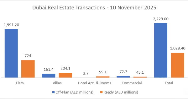 On the 10-Nov-2025, the total transacted value reached AED 3,257,427,223. Off-plan dominated with AED 2,229,038,837 (68.4%), while Ready accounted for AED 1,028,388,386 (31.6%).