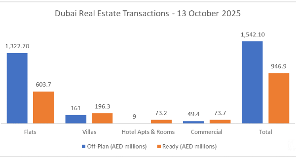 On 14-Oct-2025, the total transacted value reached AED 2.489 billion. Off-plan dominated with AED 1.542 billion (62.0%), while Ready accounted for AED 947 million (38.0%).