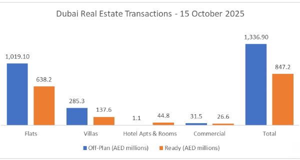 On the 15-Oct-2025, the total transacted value reached AED 2,184.2 million. Off-plan dominated with AED 1,336.9 million (61.2%), while Ready accounted for AED 847.2 million (38.8%).