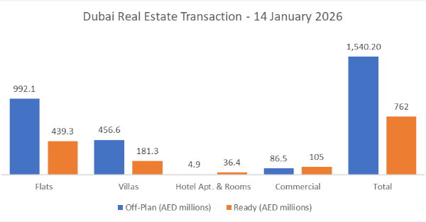 | On the 15-Jan-2026, the total transacted value reached AED 2,302,192,960. Off-plan dominated with AED 1,540,191,366 (66.9%), while Ready accounted for AED 762,001,594 (33.1%). | ||||||||||||||||||