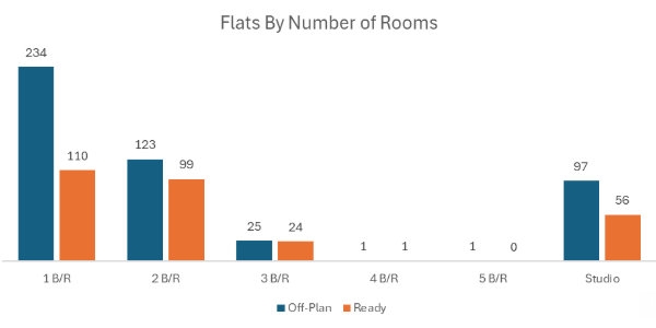 | Off-plan activity was led overwhelmingly by flats, with villas providing a strong secondary pillar and minimal hotel-room contribution. |