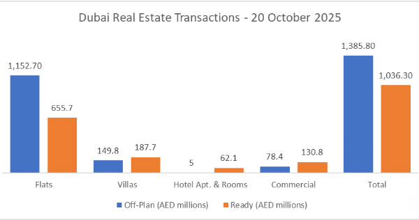 On 20-Oct-2025, the total transacted value reached AED 2.422 billion. Off-plan dominated with AED 1.386 billion (57.2%), while Ready accounted for AED 1.036 billion (42.8%).