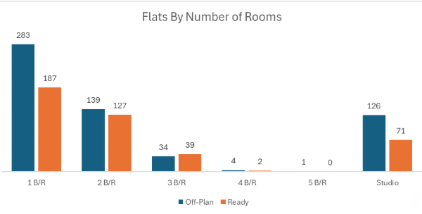 | Off-plan activity was heavily flat-led, with villas a clear second; commercial and hospitality were marginal. |