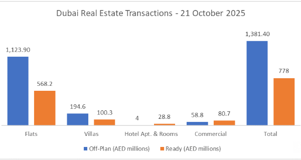 On the 21-Oct-2025, the total transacted value reached AED 2,159,393,370. Off-plan dominated with AED 1,381,366,052 (64.0%), while Ready accounted for AED 778,027,319 (36.0%).