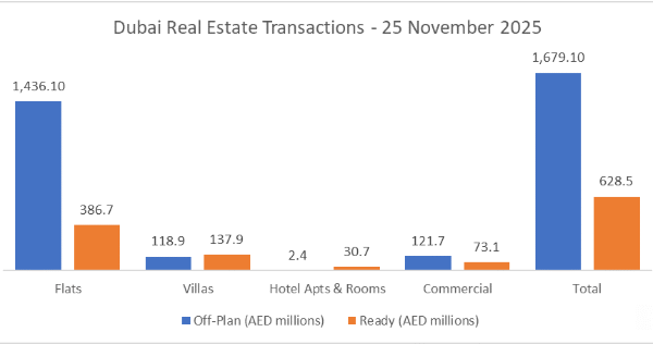 On the 25 November 2025, the total transacted value reached AED 2,307,665,365. Off-plan dominated with AED 1,679,132,365 (72.8%), while Ready accounted for AED 628,533,000 (27.2%).