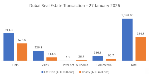 On the 27-Jan-2026, the total transacted value reached AED 2.18 billionOff-plan dominated with AED 1.40 billion (64.1%), while Ready accounted for AED 784.8 million (35.9%).