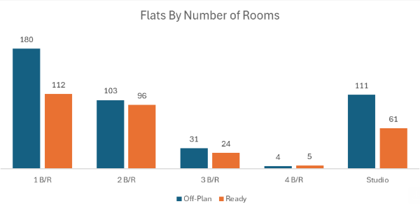 Off-plan activity was overwhelmingly flat-led, with villas a meaningful secondary driver and commercial adding a notable share.