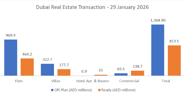 | On the 29-Jan-2026, the total transacted value reached AED 2.18B. Off-plan dominated with AED 1.37B (62.7%), while Ready accounted for AED 0.81B (37.3%). | ||||||||||||||||||