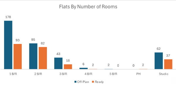 Off-plan activity was overwhelmingly flat-led, with villas a distant second and limited commercial/hotel apartment contribution.