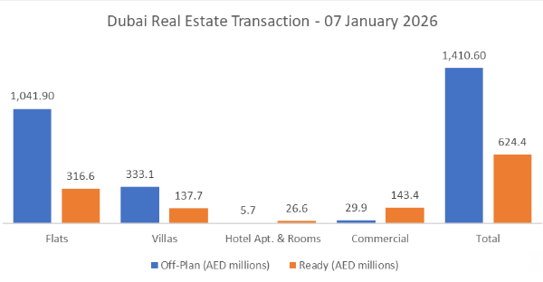| On the 07-Jan-2026, the total transacted value reached AED 2.03bn. Off-plan dominated with AED 1.41bn (69.3%), while Ready accounted for AED 624.4m (30.7%). | ||||||||||||||||||