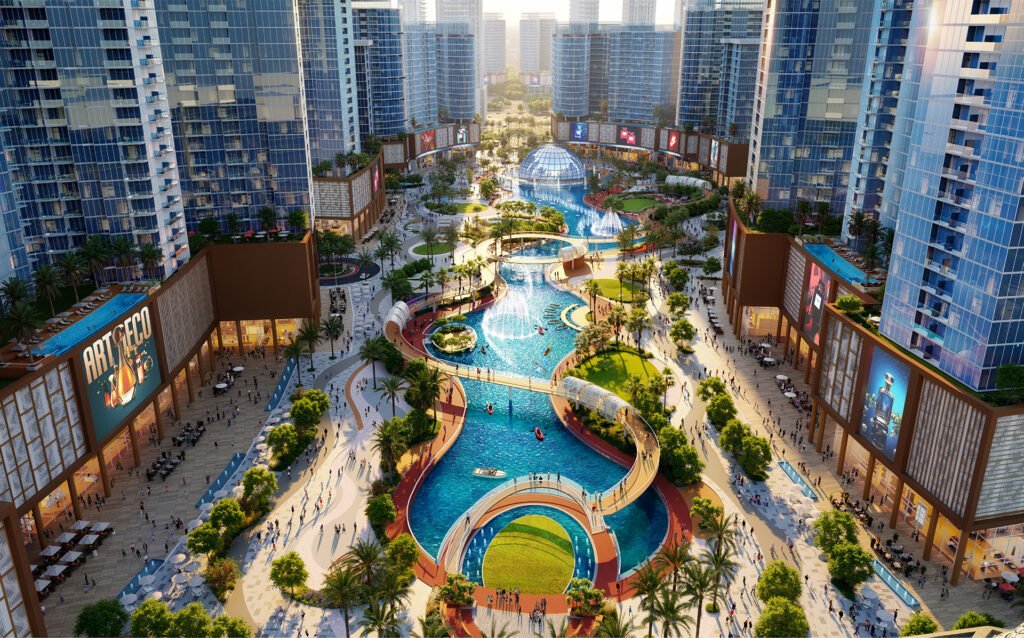 Tiger Downtown is a master-planned, lagoon-front community that serves as a new heart for Ajman. The development consists of a total of 76 buildings, including 20 lagoon-front buildings and 56 perimeter buildings. It features a massive private lagoon area of 13,795 Sq.M with a 375 M length and illuminated fountains. The community is designed for active living, blending residential units, retail stores, and vast greenery into one connected address described as “Downtown, the Ajman way.